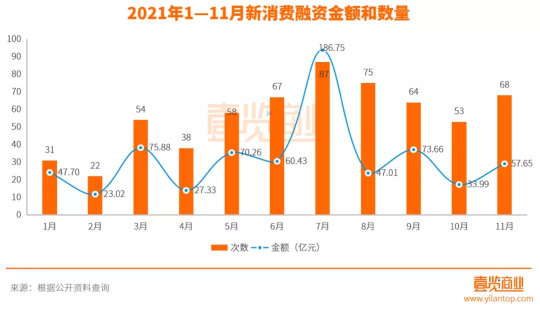 据《壹览商业》不完全统计,11月份新消费领域共发生68起融资事件,融资金额为57.65亿元(不包含16起未披露金额融资),比上个月高出近25亿元。从整年来看,11月的融资数量与6月最接近,融资金额也相差不大。