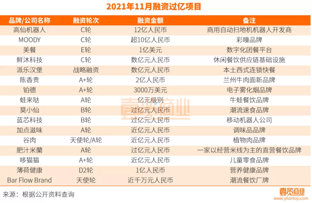 此外,鲜沐科技、派乐汉堡各获得3亿元融资,陈香贵获得2亿元融资,蛙来哒、肥汁米蘭、Bar Flow Brand则分别获得1亿元融资。