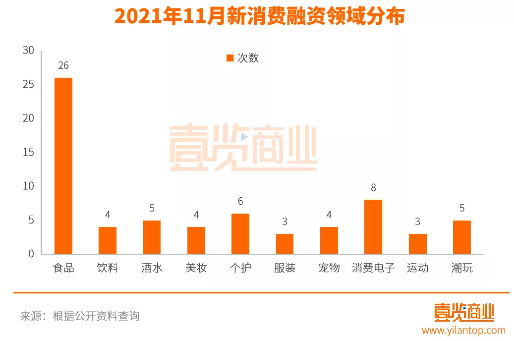从融资数量来看,在《壹览商业》长期观察的14个业态中,本月有4个领域未发生融资,分别为配饰、家居、母婴和服务商领域。而融资次数最多的依旧是食品领域,11月食品领域共发生26起融资事件,融资金额为24.3亿元。其次则是消费电子领域的8起融资,融资金额为15.75亿元。