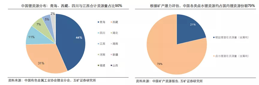 中国锂资源中盐湖卤水占据的比例更高,接近79%的份额。从地域上来看,青海和西藏占据了大部分的资源。