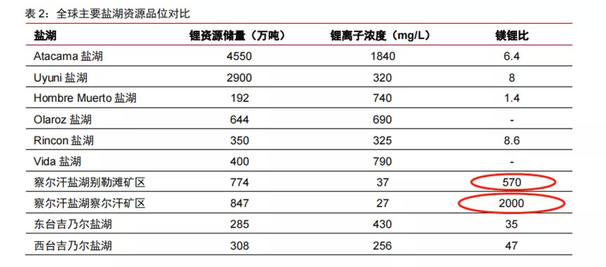 中国储量最大的察尔汗盐湖镁锂比远远高于南美盐湖,锂离子含量明显低于南美盐湖。