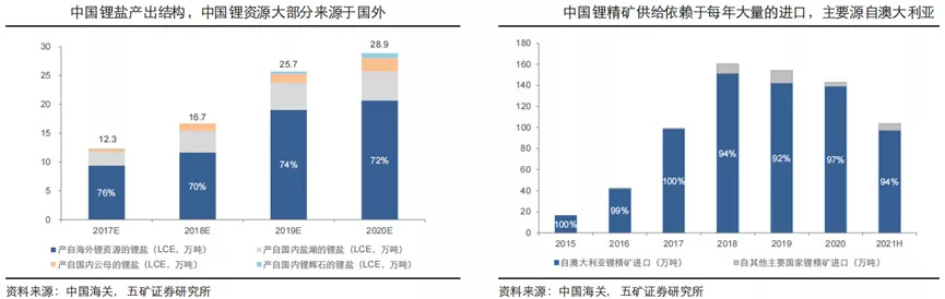 中国作为全球最大的锂消费国,对锂资源的掌控力却不容乐观。锂资源对外依存度高达72%,近年来自澳洲进口锂矿比例均超过90%以上。