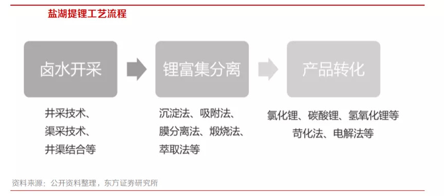 盐湖提锂工艺包括前端卤水开采、中端富集分离,后端产品转化三个环节,工艺的差别主要体现在中端富集分离环节。