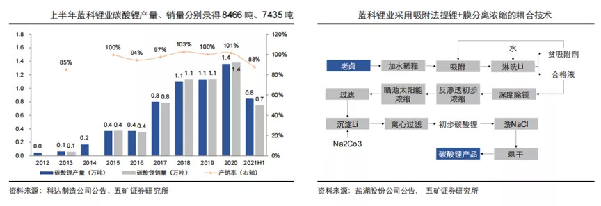 不得不提的是,盐湖股份与科大制造旗下的蓝科锂业。通过采用吸附提锂+膜分离浓缩的耦合技术,近三年产销量维持在万吨级以上,是国内盐湖提锂企业中碳酸锂出货量最高的公司。