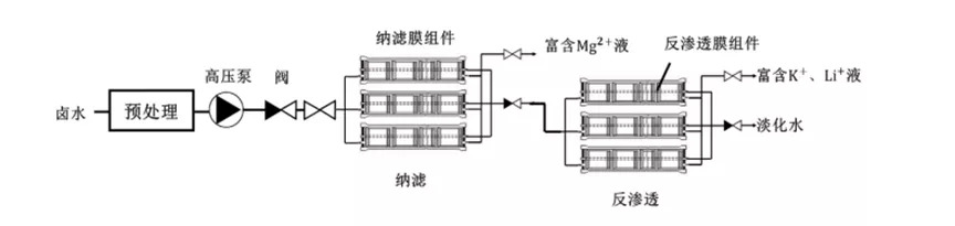 在盐湖提锂应用的原理,就是当原料卤水通过纳滤膜时,锂、钠等一价离子透过膜,镁、钙等二价离子被纳滤膜隔离,从而实现了镁、锂离子分离的目的。