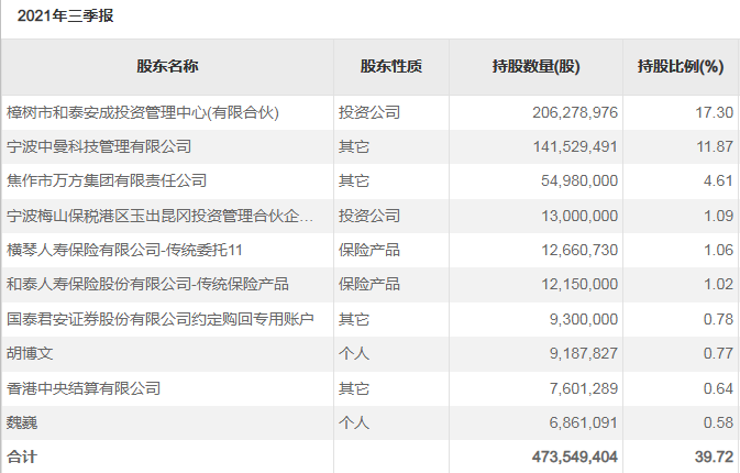 其中,嘉益投资从2021年3月开始减持,截至2021年9月底其持股比例已经跌到0.58%以下,并从上市公司前十大股东名单中“消失”。金投锦众则自2020年年底开始减持,到2021年8月其将所持141,529,491股股份(占公司总股本的11.87%)转给关联公司宁波中曼;据查,杭州锦江集团与杭州正才通过开曼铝业间接控股宁波中曼。