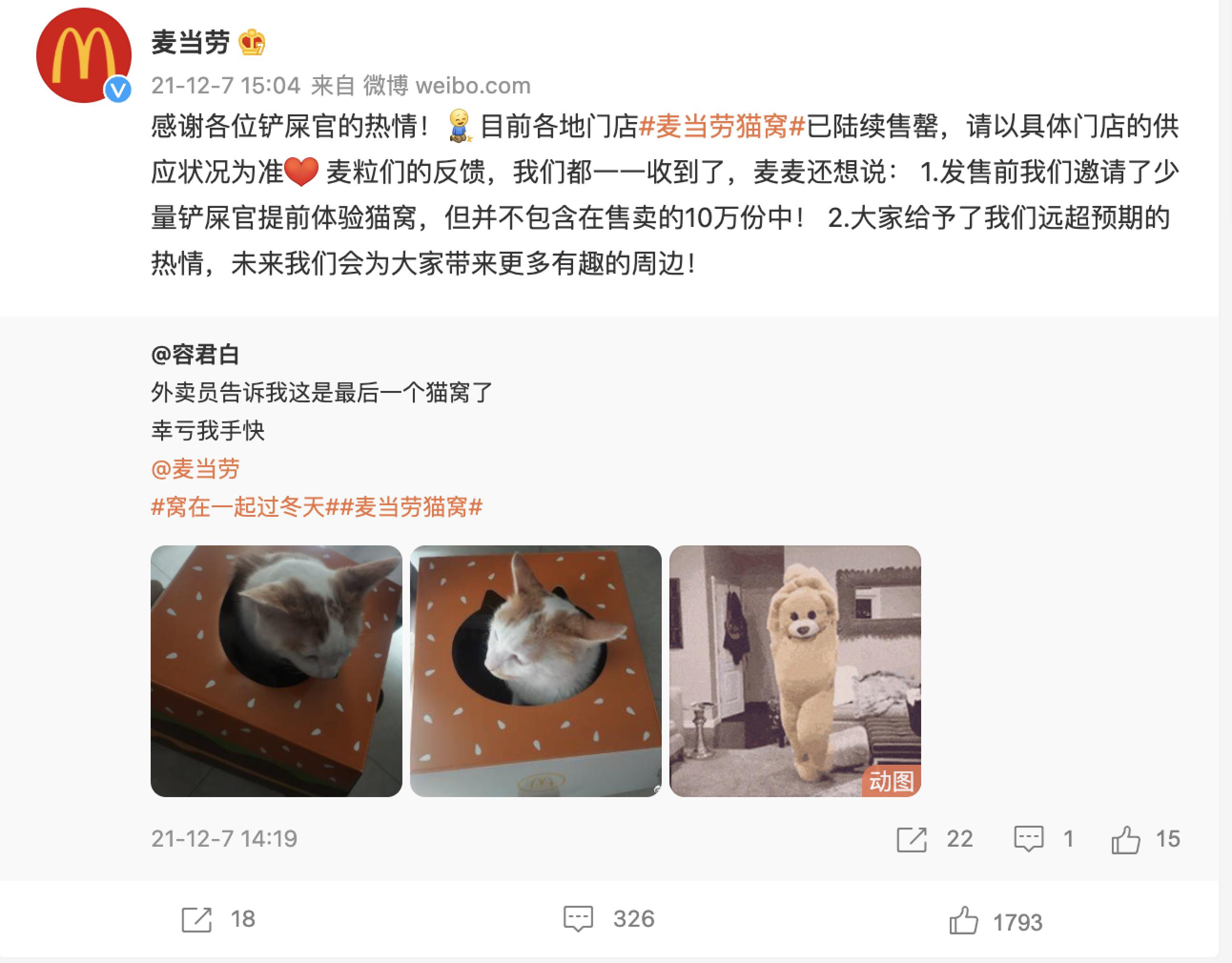 麦当劳最近一次的热搜话题是“麦当劳崩了”。“崩了”的是麦当劳小程序,原因与近期推出的麦当劳猫窝套餐有关。麦当劳利用小猫咪都爱钻盒子的特点,制作了汉堡形状的猫窝,一时备受追捧,导致大量网友涌入麦当劳小程序抢购,造成短时间内宕机。12月7日,麦当劳在微博回复网友称,该产品已陆续售罄。
