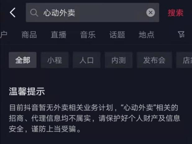 在抖音内搜索心动外卖,确实原来的小程序已经下架,且表示目前并无外卖相关业务计划。