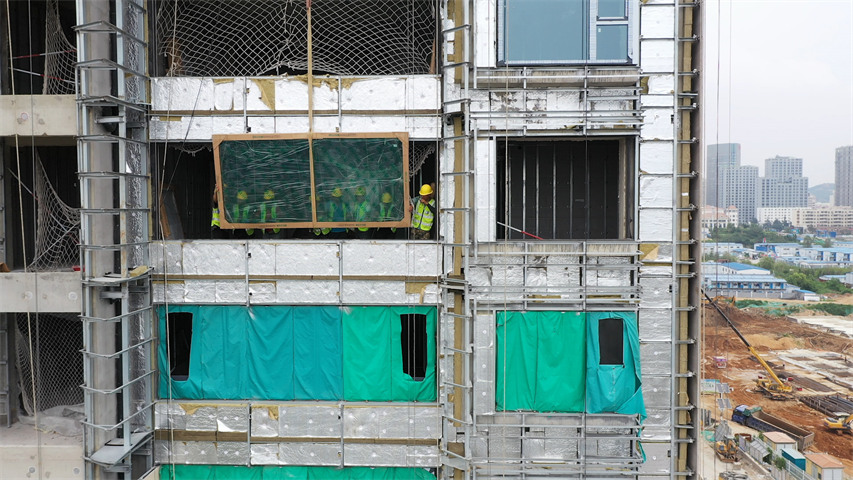 银丰·玖玺城的门窗安装采用装配式作业,厂商预先组装好的门窗产品被运至工地,由起重机吊运至相应楼层进行安装。因其产品结构的整体性,每扇窗户都重达500斤,现场必须由12个经验丰富的工人同时作业,才能完成安装。如此操作,最直接的结果就是,成本翻倍。