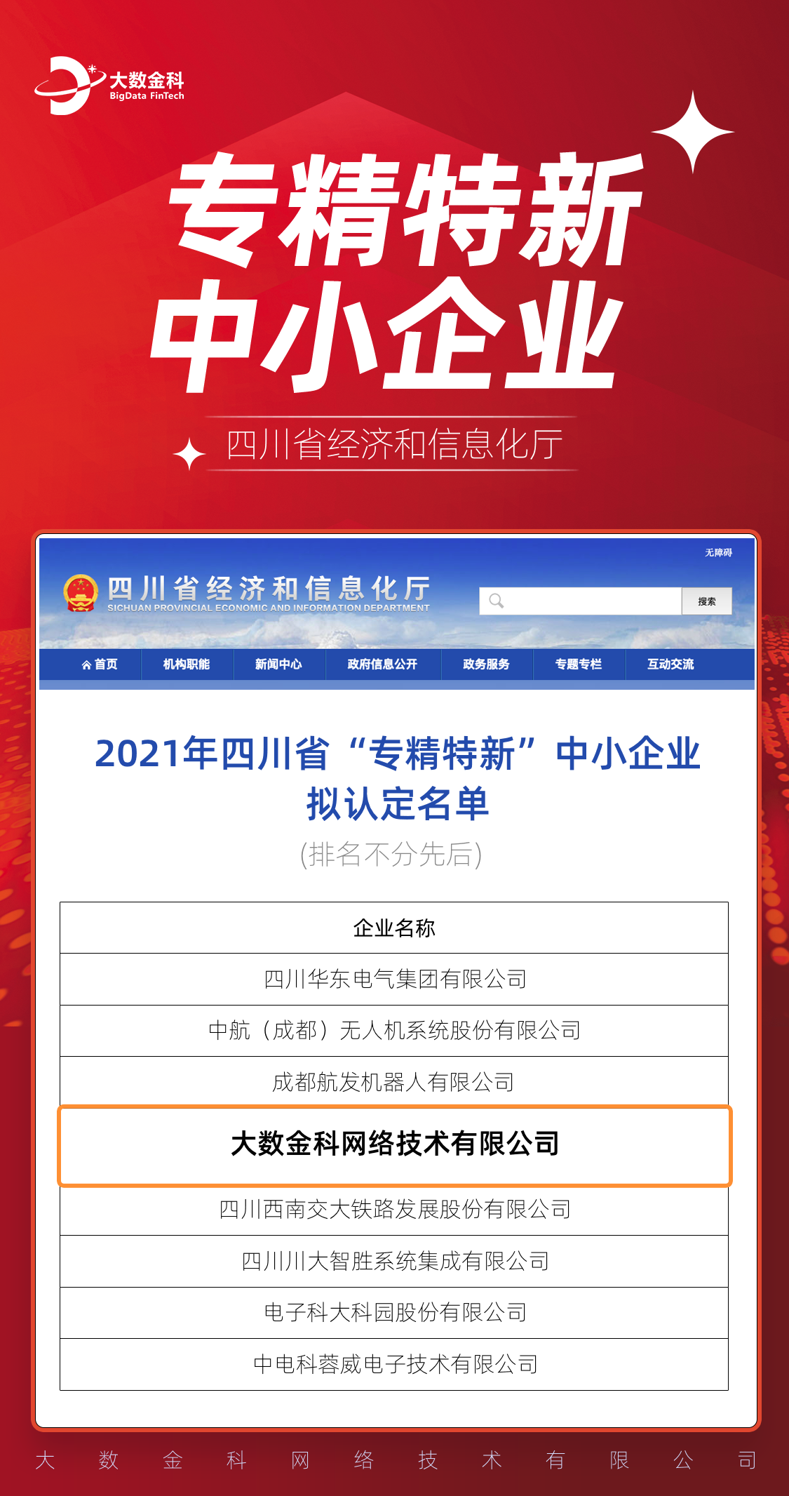 近日,四川省经济和信息化厅对外发布了2021年四川省“专精特新”中小企业名单。大数金科网络技术有限公司成功获得“专精特新”中小企业认定。