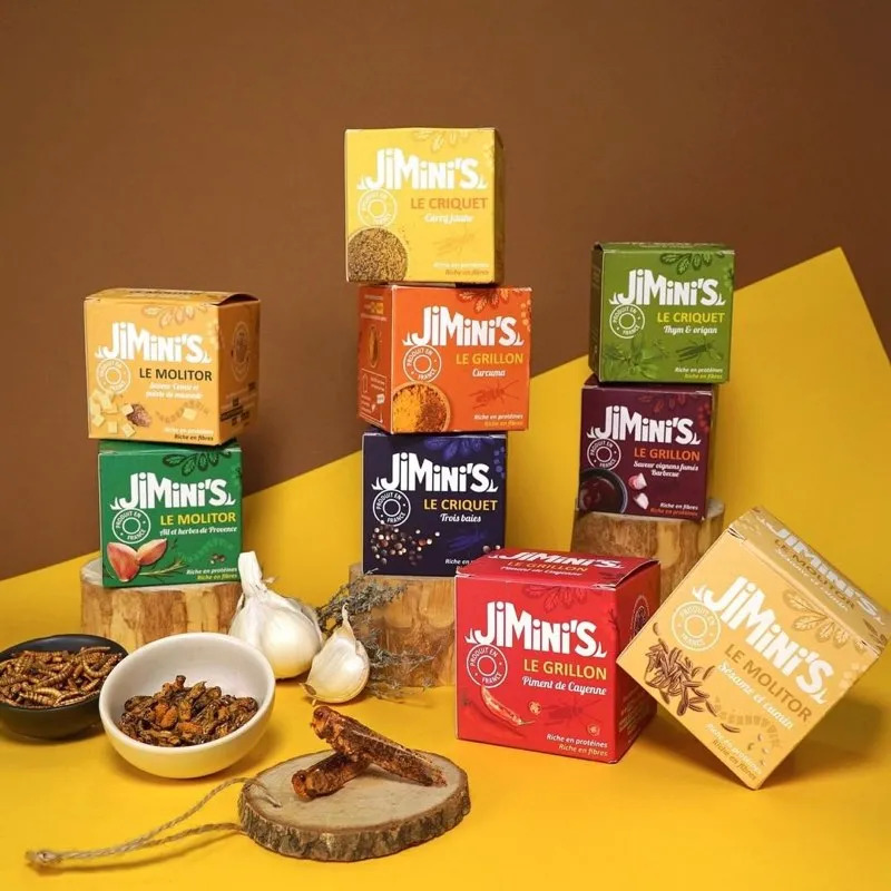 法国初创公司Jimini's推出了昆虫零食系列,包括不同口味的蚱蜢、粉虫和蟋蟀,其中原味蚱蜢每100g含有蛋白质70g,原味粉虫每100g含蛋白质56g,原味蟋蟀每100g含蛋白质62g。