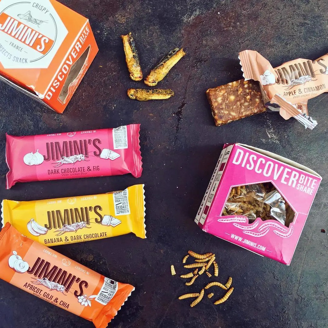 Jimini's的蛋白棒系列,由94.5%的有机种植成分支撑,天然无麸质、无牛奶、无添加剂,且富含水牛蠕虫粉,口味包括苹果焦糖味、无花果巧克力味、香蕉巧克力味、杏与巴旦木味。