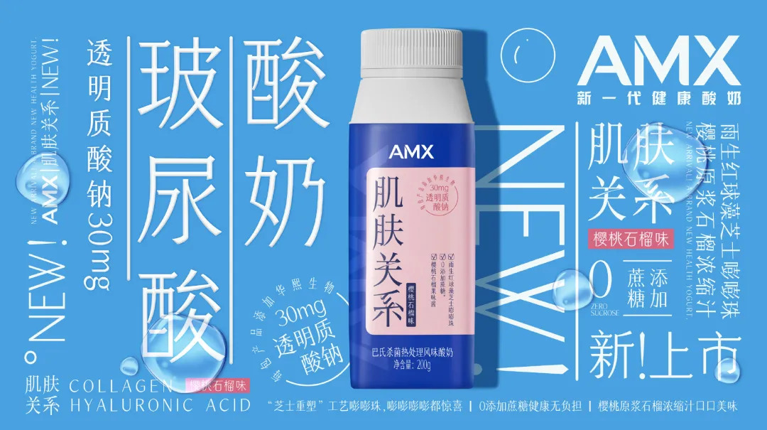 安慕希近日推出了新品AMX「肌肤关系」玻尿酸酸奶,每瓶添加了30mg华熙生物食品级玻尿酸,酸奶中的嘭嘭珠添加了抗氧虾青素,每100g蛋白质含量为3.1g,补充蛋白的同时,满足了消费者爱美的需求。