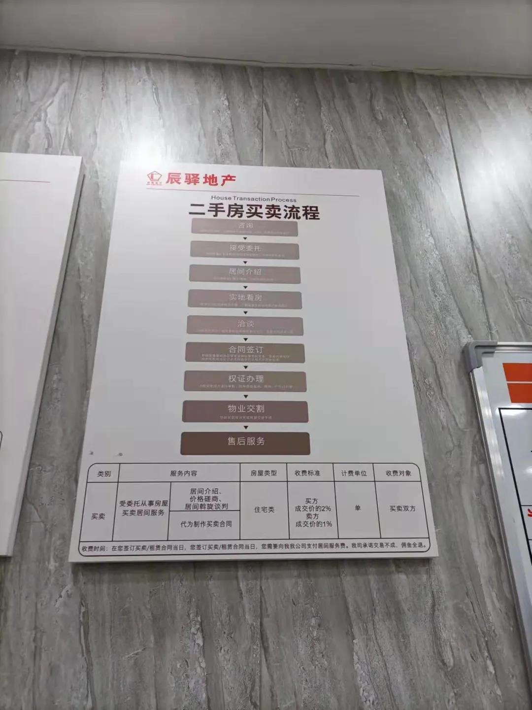 上海辰驿房地产经纪有限公司自2020年4月起从事房地产经纪服务的经营活动,在分支机构店堂内张贴有“二手房买卖流程”,并对外承诺对买方按房屋买卖成交价的2%收取佣金(居间服务费),对卖方按房屋买卖成交价的1%收取佣金(居间服务费)。