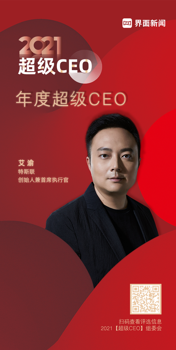 特斯联创始人兼首席执行官艾渝成功登陆「界面新闻2021年度超级CEO」榜单。