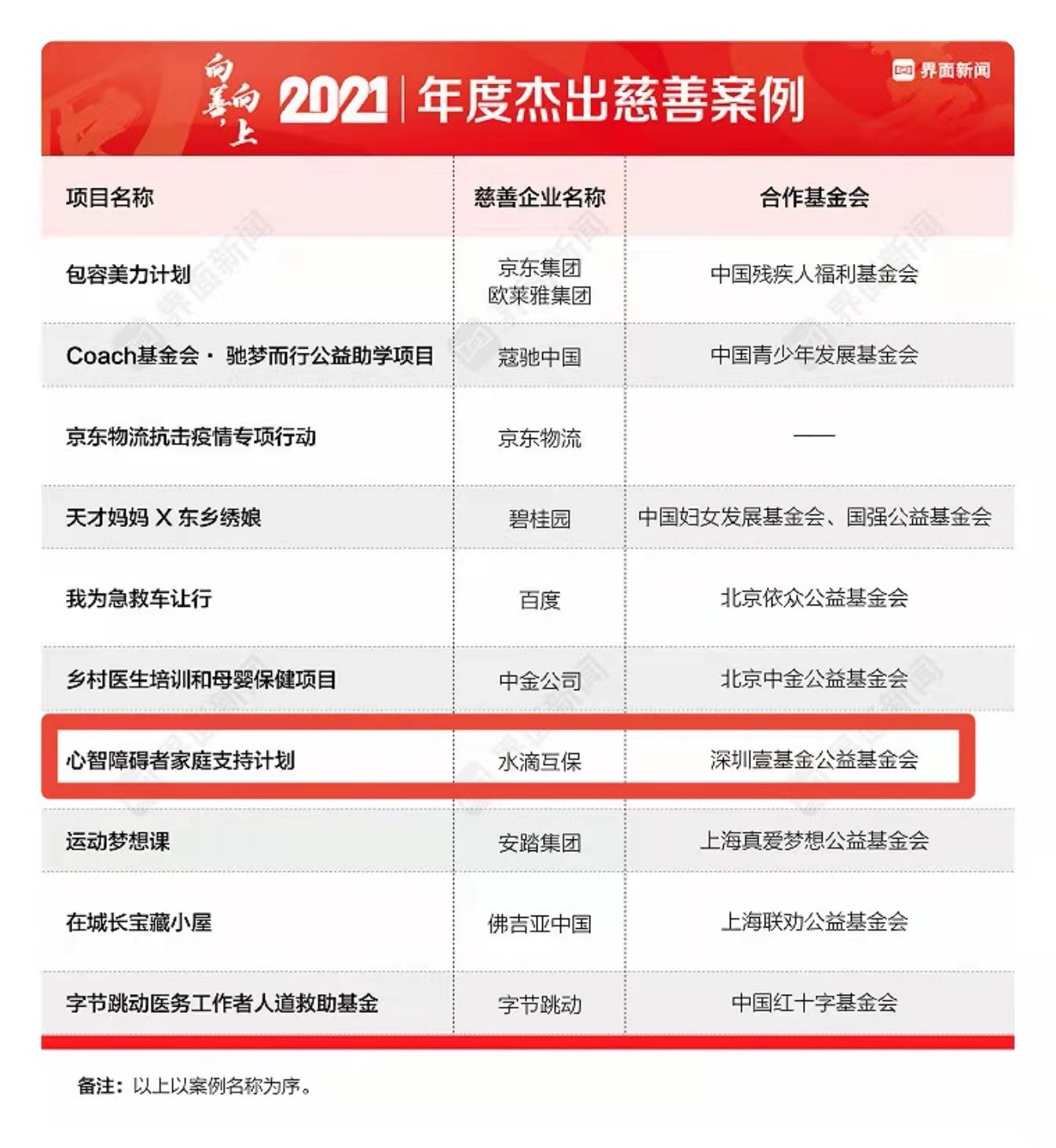 界面新闻认为,中国慈善公益的未来在于专业、连接和透明,优秀的慈善案例是对中国公益慈善界模式的总结、创新的启迪、能量的发扬。商业公司与慈善公益基金会的合作往往是最佳方式之一,通过案例申报、桌面调研、企业或基金会走访等方式,再结合算法,从项目规模、受益群体、综合影响力、创新性、前瞻性、发展潜力等方面进行综合评价,最终产生10个入选案例。