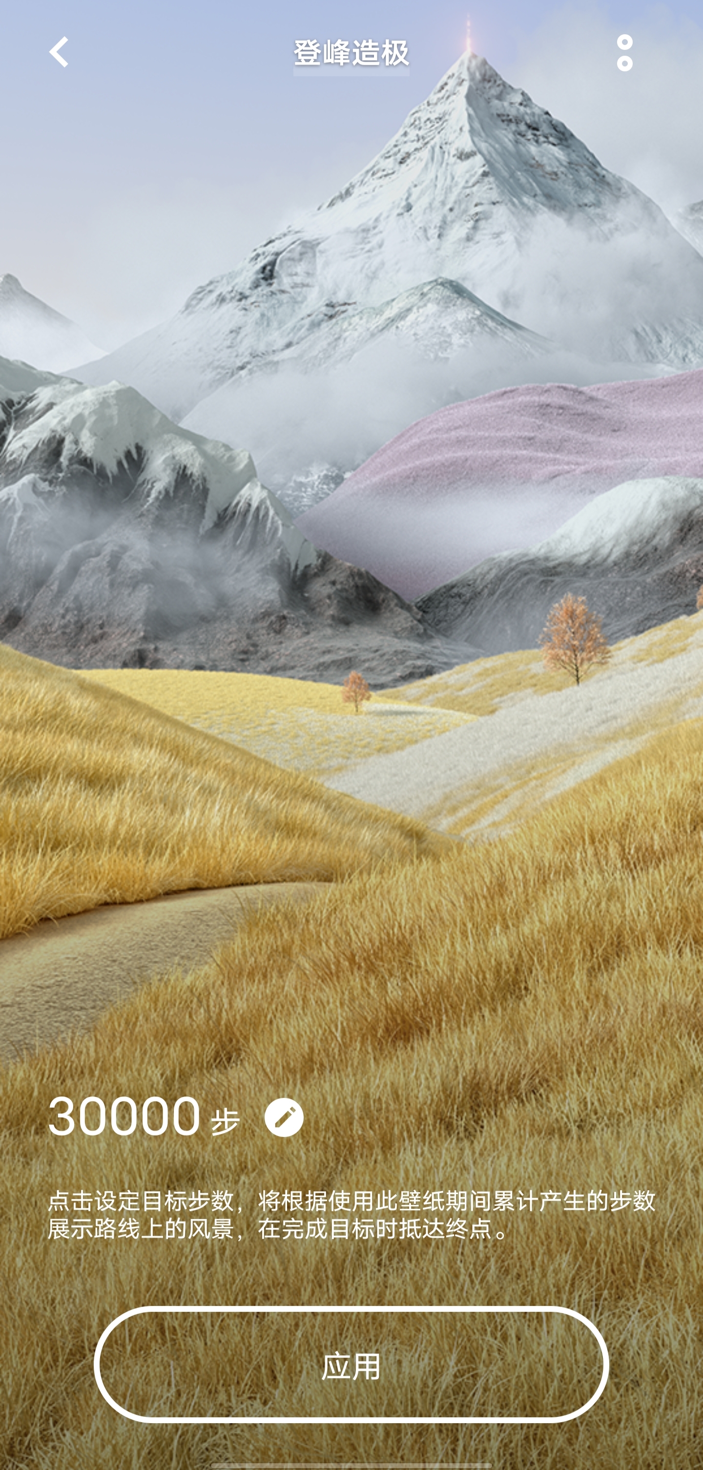 例如在“登峰造极”的主题下,系统会读取用户每日的步数,当步数增加时,壁纸会从当前路线上前进,而“登峰造极”线路的终点,就是珠峰的顶端,那么此时,也意味着用户完成了自己设置的每日步数目标。