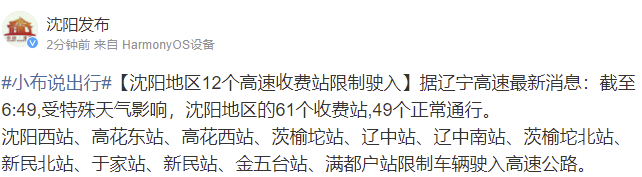 @沈阳发布 微博12月10日消息,据辽宁高速最新消息:截至6:49,受特殊天气影响,沈阳地区的61个收费站,49个正常通行。