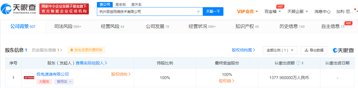 天眼查APP显示,12月10日,杭州百世网络技术有限公司发生工商变更,原股东杭州阿里创业投资有限公司等全部退出,新增股东极兔速递有限公司,持股比例100%,同时,企业法定代表人从陈微变更为樊苏洲。