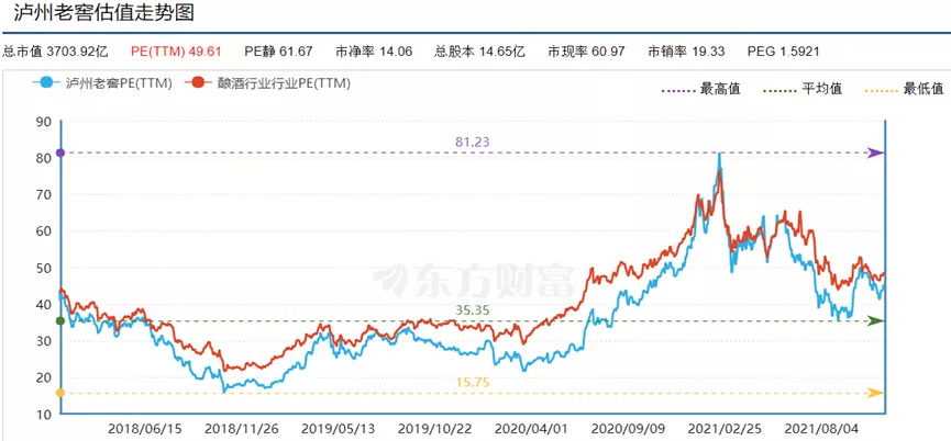 看泸州老窖近年来动态估值走势,35.35倍估值平均值成为“水平线”。