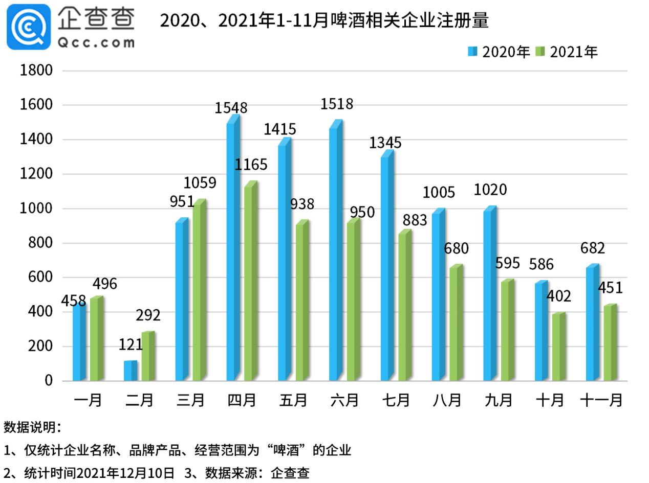 企查查数据显示,今年1-11月全国共新增啤酒相关企业7911家,同比下降26%。具体来看,2月注册量最少,仅292家;3、4月相关企业注册量突破千家,分别新增1059家和1165家;10月注册量为402家,11月略有回升,共新增451家,环比增长12%。