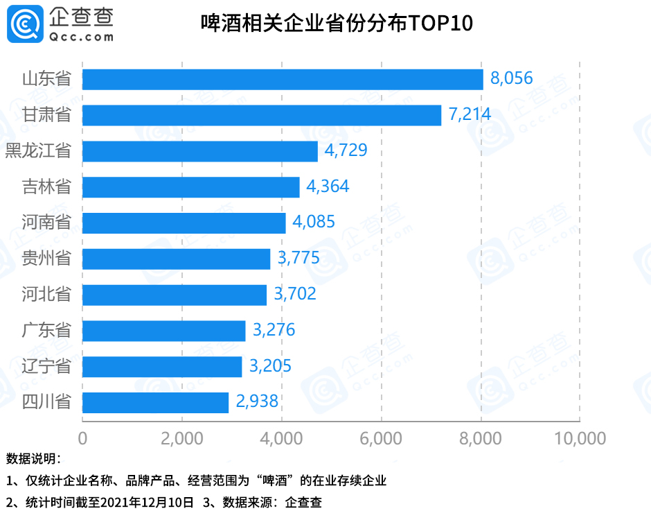 企查查数据显示,山东省啤酒企业数量最多,拥有8056家相关企业,领先于全国其他省份,占据了全国总量的11%。甘肃省、黑龙江省分别以7214家和4729家排名二三位。