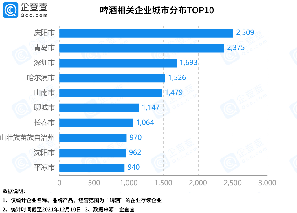 企查查数据显示,庆阳市啤酒相关企业数量最多的,达2509家,占据了甘肃省总量的35%。青岛市、深圳市分别以2375家和1693家位列二三位。