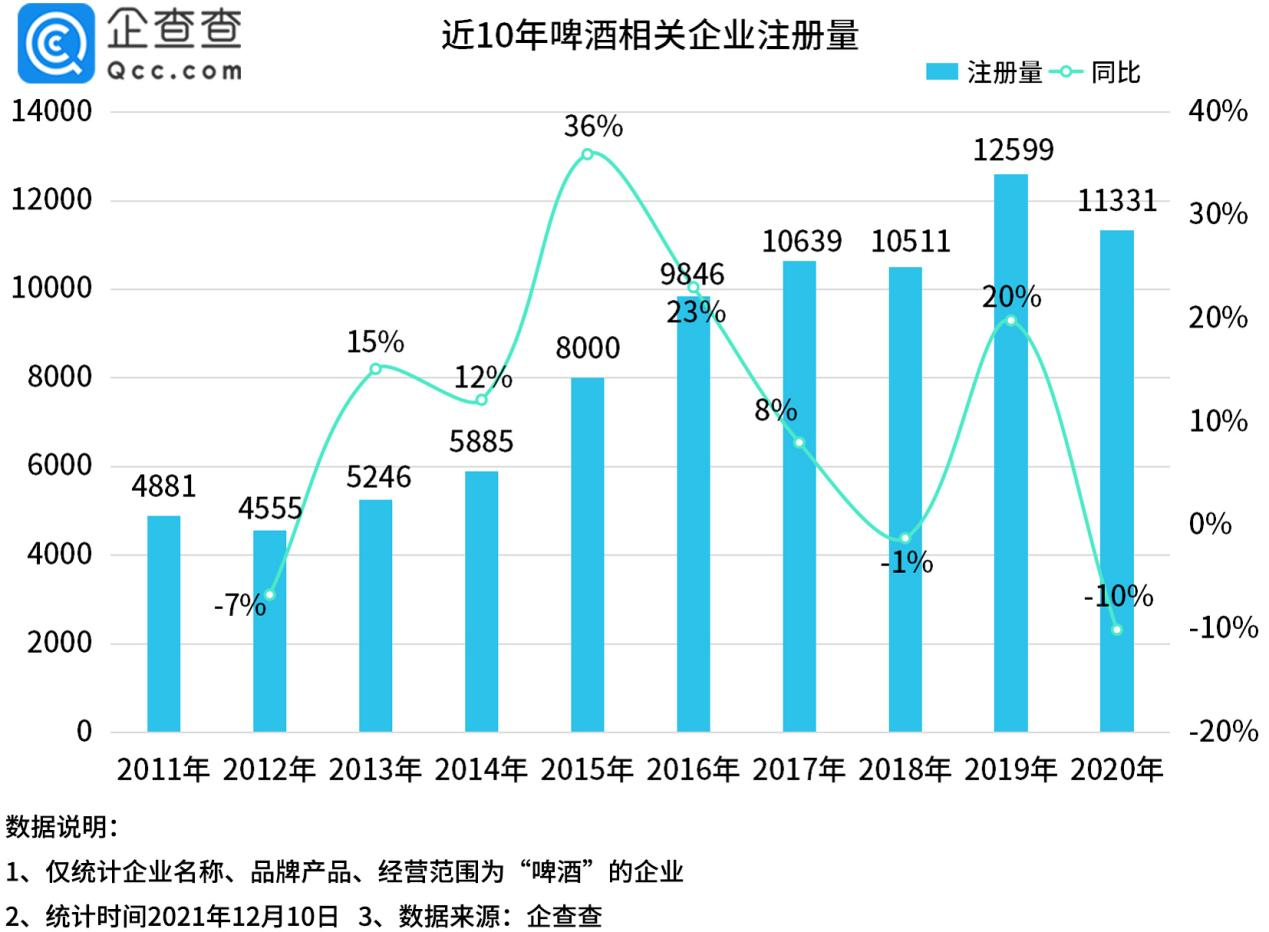 企查查数据显示,2011-2019年我国啤酒相关企业年注册量逐年攀升,2015年注册量达8000家,同比增长36%,达到近年来增速峰值。2019年注册量达1.26万家,为历年来最高,同比增长20%。2020年注册量略有下降,共新增注册量1.13万家,同比下降10%。