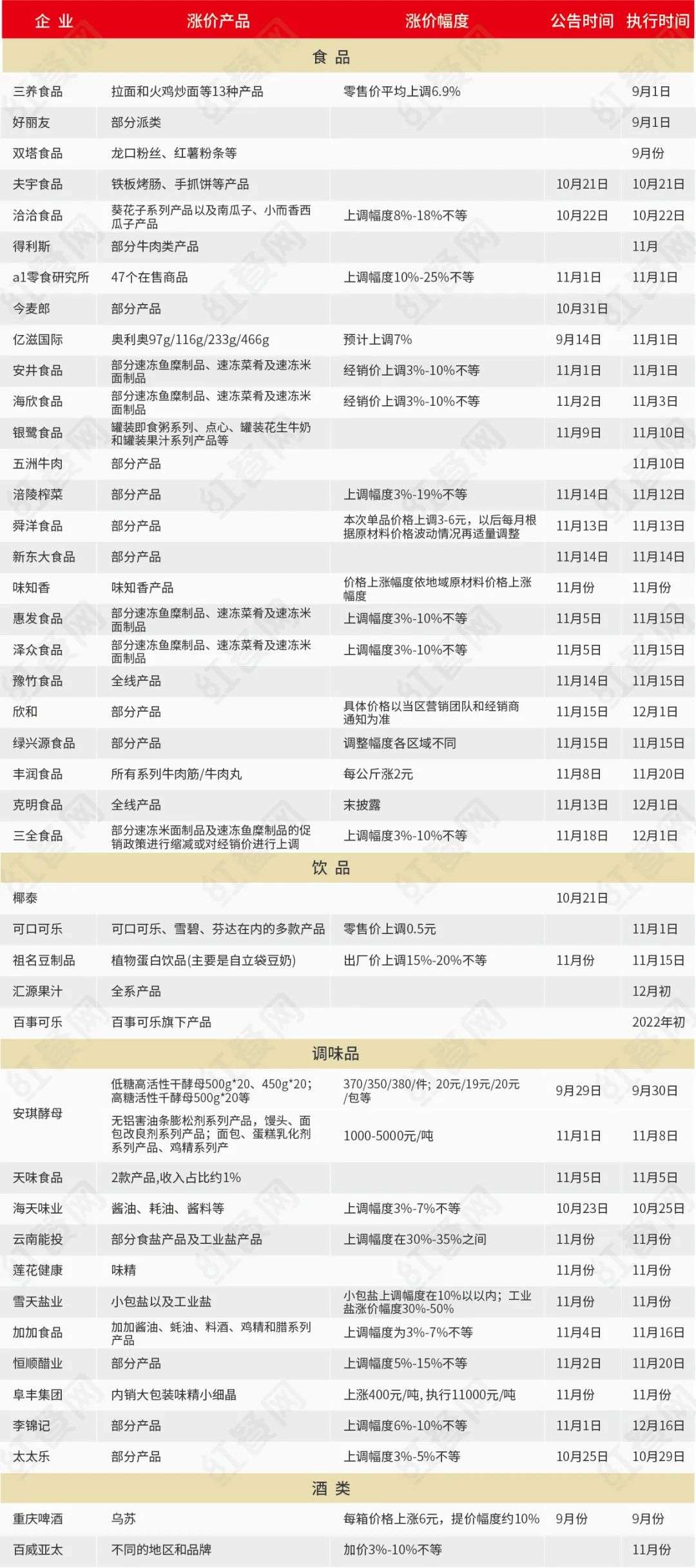 据不完全统计,仅今年9-11月,宣布涨价的企业超过40家,覆盖调味品、速冻食品、休闲零食与乳制品等领域。