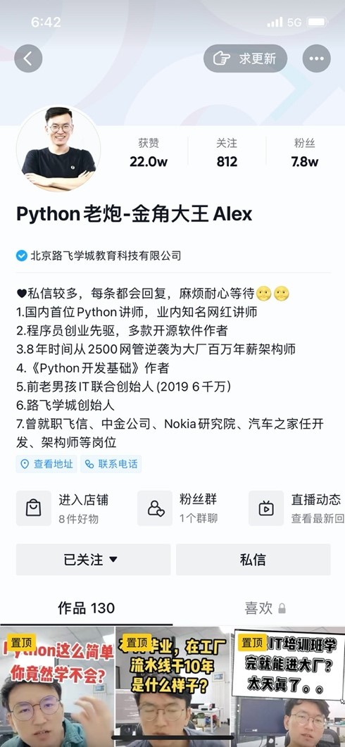 作为一名Python讲师,Alex自今年6月入驻抖音以来,不到六个月时间就已吸引超7万粉丝。而他本人的过往经历也颇具传奇色彩,曾用8年时间从2500网管逆袭称大厂百万年薪架构师,还出了两本Python相关书籍。
