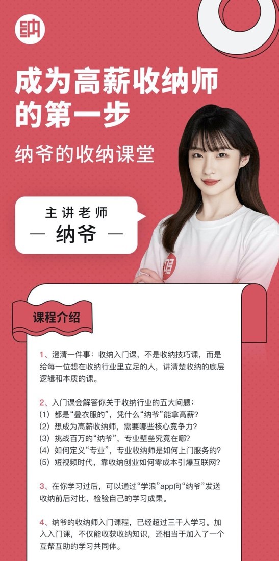 “原来叠衣服也能赚钱,那我也去学。” 纳爷在视频中称,“前前后后共花了5万块钱。”回国后,纳爷通过帮十多个亲戚、朋友家里收纳,并让他们发朋友圈宣传,从而完成实操+口碑传播的过程,并正式于2020年4月开始创业。