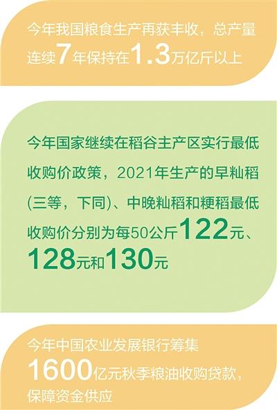 保障收购资金充足。“我们结合全省粮食产量,今年安排800亿元信贷资金支持秋粮收购,其中政策性收购资金500亿元、市场化收购资金300亿元,全力保证资金供应。”中国农业发展银行黑龙江分行有关负责人介绍。从全国看,今年10月1日至11月21日,中国农业发展银行累计投放秋季粮棉油收购贷款921.3亿元。其中粮油收购贷款投放439.18亿元,占整个收购季粮油收购贷款投放计划的27%。