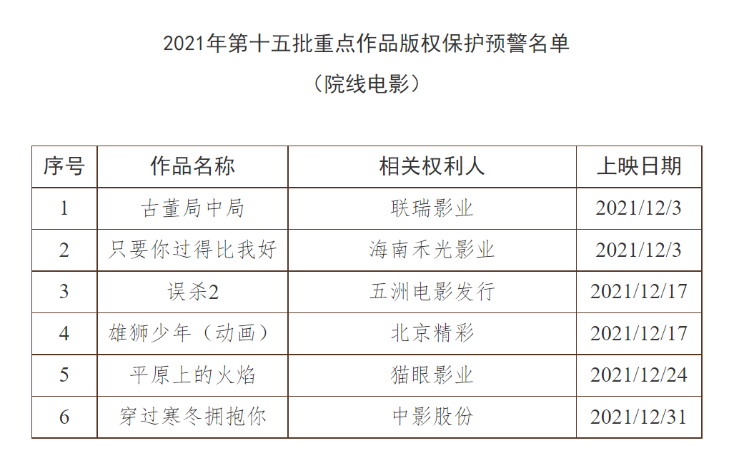 国家版权局网站12月10日消息,按照国家版权局《关于进一步加强互联网传播作品版权监管工作的意见》及版权重点监管工作计划,根据相关权利人上报的作品授权情况,国家版权局公布2021年度第十五批重点作品版权保护预警名单。