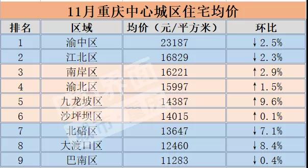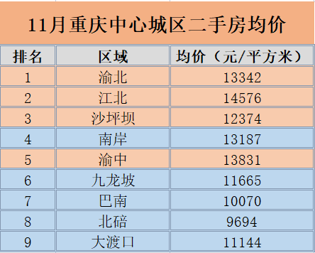铭腾机构数据显示,11月,沙坪坝、渝中、江北、渝北四个区中,沙坪坝区新房均价在14015元/平米,环比上涨0.1%;渝中区均价23189元/平米,环比下降2.5%;江北区均价16829元/平米,环比下降2.3%;渝北区15997元/平米,环比下降1.5%。