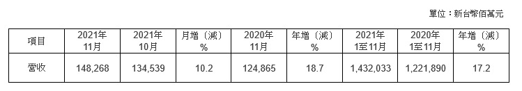 12月10日,台积电网站公布2021年11月营收报告。2021年11月合并营收约为新台币1482.68亿元,较上月增加了10.2%,较去年同期增加了18.7%。累计2021年1至11月营收约为新台币1.43万亿元,较去年同期增加了17.2%。