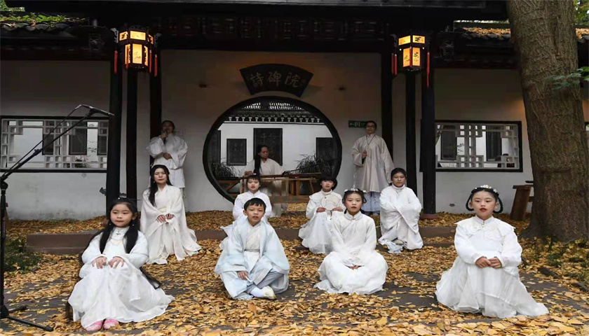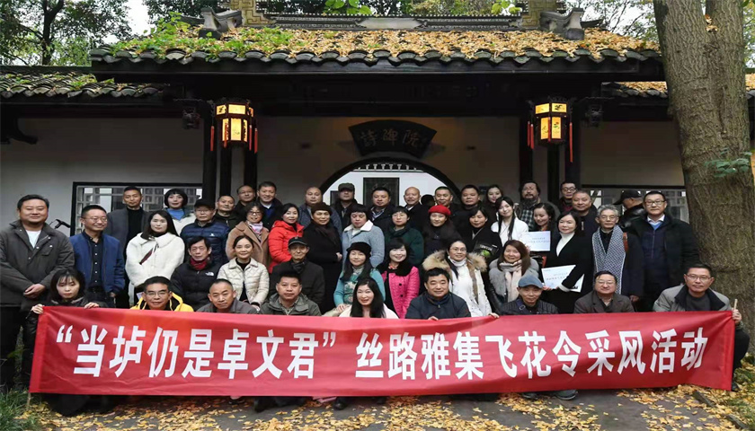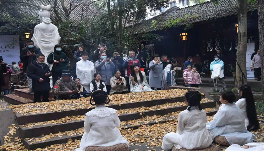 “美酒成都堪送老,当垆仍是卓文君”。12月11日,四川邛崃文君井公园银杏纷飞,古风习习,一场以汉服、古琴、书法、银杏为主题的古风雅集正在优雅上演。来自四川各地的60余名诗人走进邛崃,开展丝路雅集飞花令文君主题采风创作活动,纷纷陶醉在临邛古城的古风今韵里。