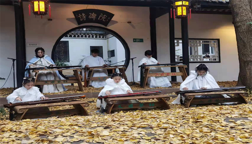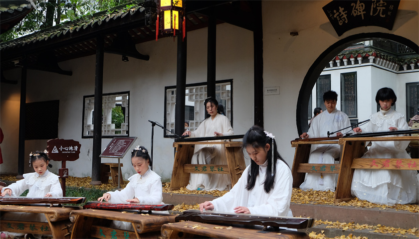 两株高大的银杏树下,堆积着厚厚一层金黄的树叶,文君琴社的师生们正在落叶铺就的地毯上举行银杏墨韵古琴雅集。《凤求凰》《清平乐》《声声慢》《流水》……一首首古琴曲或清越,或深沉,或激昂,或低回,一片片黄叶翩翩飞舞,落在琴弦上,落在衣袂上,落在长发上。这场曲水流觞的古风雅集让诗人们仿佛穿越来到了西汉临邛,诗意澎湃,流连忘返。著作家、资深媒体人、四川省文艺传播促进会法人代表徐建成感慨地说,“邛崃山好水好酒好,过去来过很多次,但这一次才真正感受到了邛崃至今流淌的古风雅韵,如果要找一个诗意栖居的城市,我会选择在望山亲水古风今韵的邛崃”。