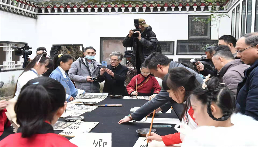 “一曲凤求凰,佳话传千古”。卓文君和司马相如琴音相通的文君井是丝路雅集飞花令采风活动的第一站。11日上午,诗人作家们一到文君井,就被这座隐藏在闹市中的古典园林深深吸引,争相在滋养着“凤求凰”爱情故事的西汉古井畔拍照留念。文君汉服协会的年经人身穿华丽的汉服,或摇团扇,或撑油纸伞,或倚琴台,或穿竹径,古风扑面而来。在诗碑院,历代名人为卓文君书写的碑刻散发出浓郁墨香。一张长桌周围,站着七八个身穿汉服的小朋友,正在一本正经地临池书写。这是知止堂书画国学馆为传承国学而举行的户外写生活动。