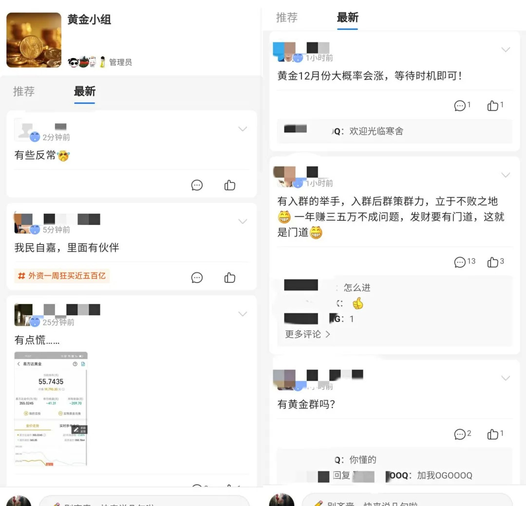 “12.10新手指南黄金近两周处于磨盘状态……”、“我猜明天一定涨,相信的老板们点下赞”、“做个小调查,你们都是什么价位上的车?我先来,实时金价374元上的车……”