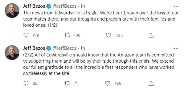 当地时间12月11日,亚马逊创始人贝索斯在推特上发文称,来自爱德华兹维尔市的消息是个悲剧,对失去那里的同事感到心碎,公司团队正对当地员工提供支持以帮助他们度过这场危机,同时“向所有在现场不知疲倦工作的救援人员表示最衷心的感谢”。