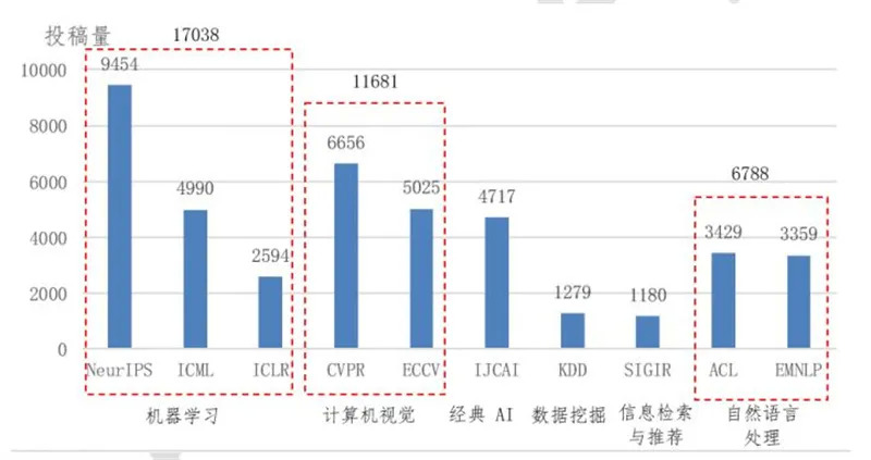▲人工智能几个重点子领域顶级国际学术会议 2020 年的投稿量情况