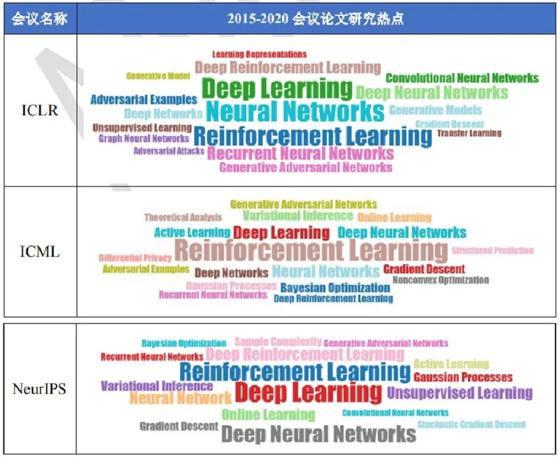 ▲机器学习三大顶会会议论文近年研究热点词云图