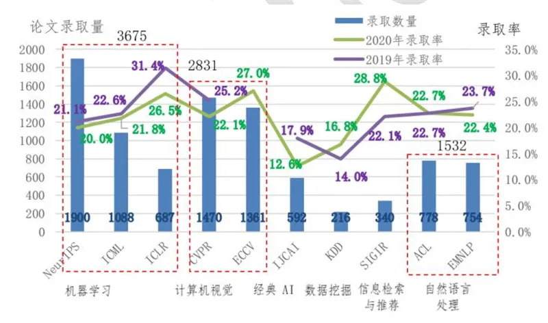 ▲人工智能几个重点子领域顶级国际学术会议 2020 年的论文录取情况