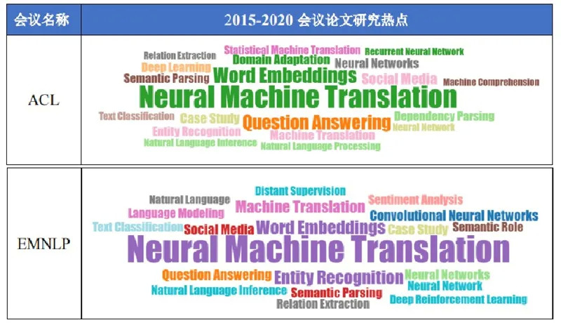 ▲自然语言处理顶会 ACL 与 EMNLP 论文近年研究热点词云图