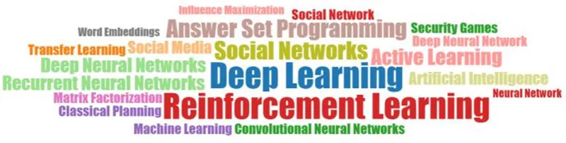 通过分析国际顶会 IJCAI 论文发现,经典 AI 领域 2015-2020 年会议论文之中最热门的研究技术点主要为强化学习(Reinforcement Learning)、深度学习(Deep Learning)及其中的卷积神经网络(Convolutional Neural Networks)与循环神经网络(Recurrent Neural Network)算法,以及迁移学习(Transfer Learning)等,较多涉及了问答集编程(Answer Set Programming)、词嵌入(Word Embeddings)、矩阵分解(Matrix factorization)等研究问题,而社交网络(Social Networks)是这些论文较热门的研究对象。