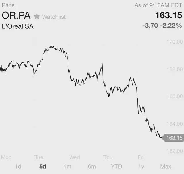 “兰蔻何韵诗事件”愈演愈烈 ,目前还没有看到刹车的局面,兰蔻品牌发生的公关灾难已让其母公司欧莱雅集团股价连续多日下跌,今日更录得5月以来的最大跌幅,截止到发稿其股价下挫逾2%,该事件导致欧莱雅集团至少蒸发了25亿欧元约185亿人民币。
