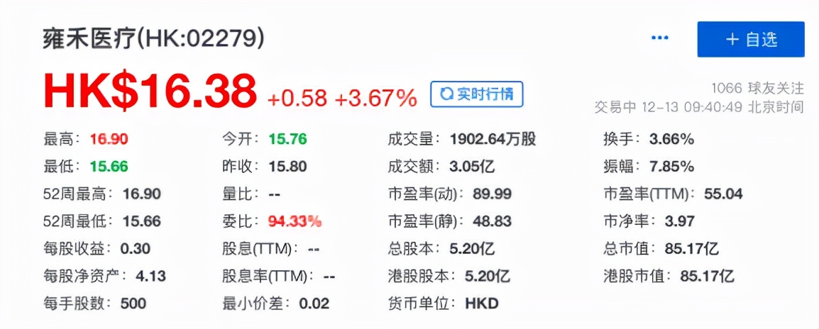 12月13日,雍禾医疗赴港上市,每股发行价15.80港元,开盘跌0.25%,报15.76港元;随后股价走高,截至发稿前报16.38港元,总市值超85亿港元。