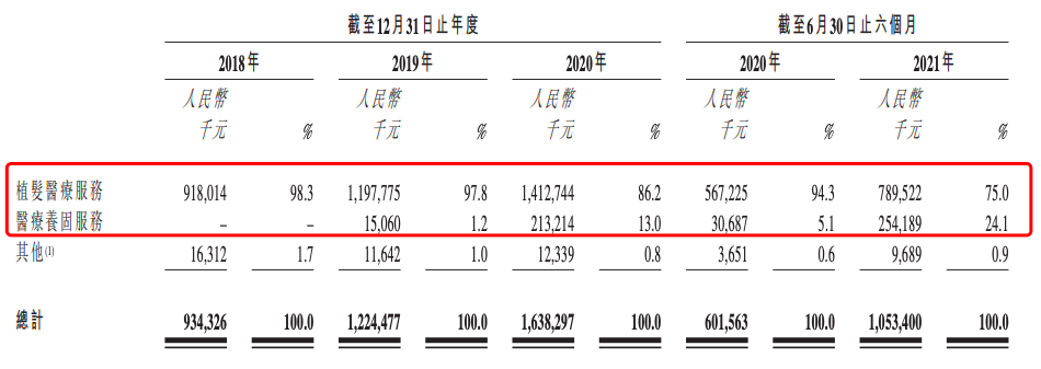 公司的收入主要来源于两个方面:植发医疗服务和医疗养固服务。