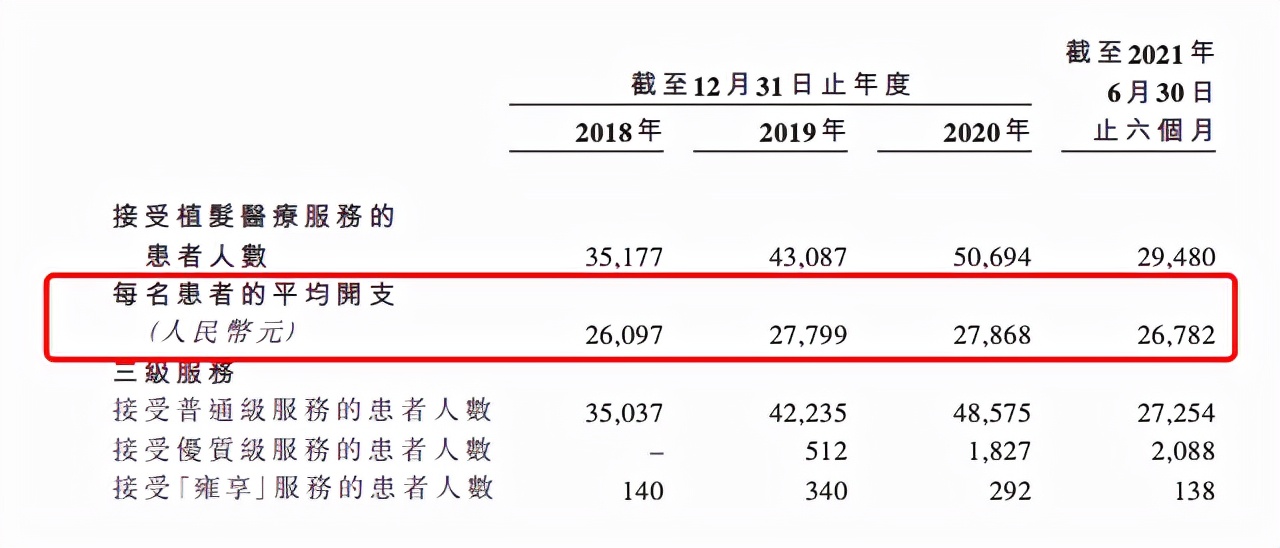印象中,植发的客单价在2-3万元之间,是一门类似于医美的暴利生意,在雍禾医疗的招股书中,也可以看到这一数据。2016年2018年间,接受植发服务的每位患者平均开支都超过了2.6万。
