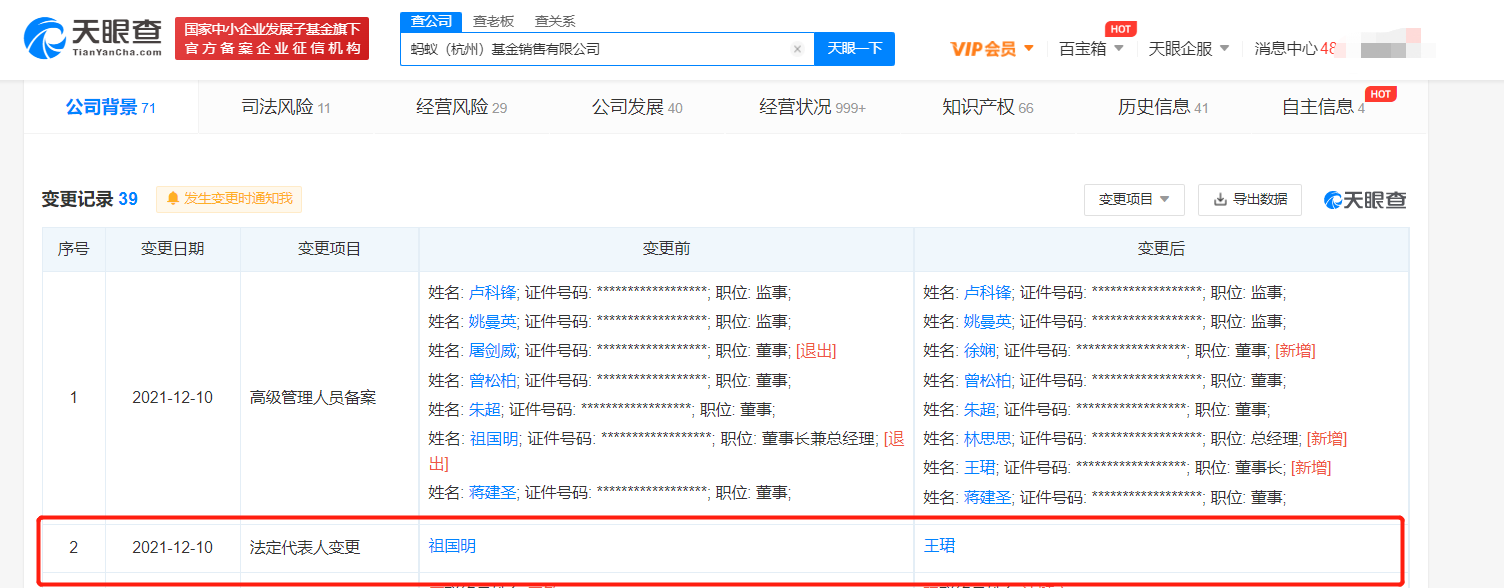 天眼查App显示,12月10日,蚂蚁(杭州)基金销售有限公司发生工商变更,法定代表人由祖国明变更为王珺。